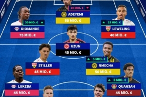前锋:迪奥曼德(莱比锡,7500万欧)、阿德耶米(多特,5000万欧)、勒威林(斯图加特,4000万欧)